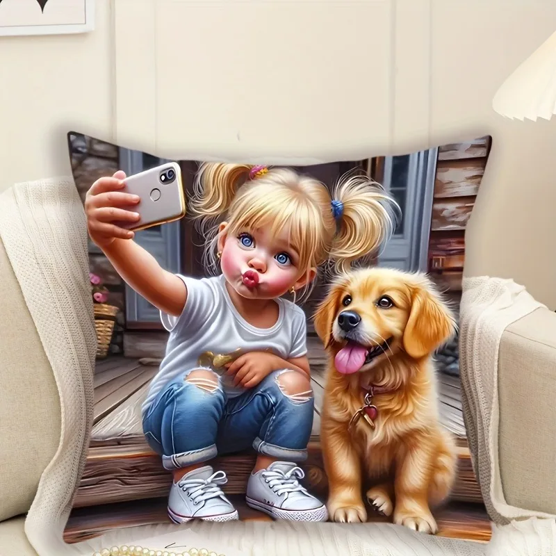 Bezauberndes bedrucktes Kissenbezug mit Mädchen und Hund, Dekorationskissen, Heimdekoration, t&...