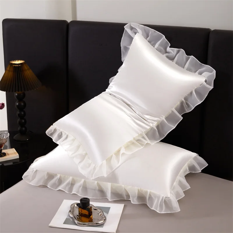 1 Stück 2-teiliger Rüschen-Kissenbezug aus Seidensatin, gewebte Spitze, aktiver Druck, mas...